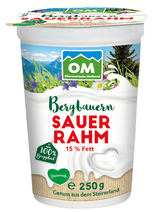 Der Sauerrahm der Obersteirischen Molkerei wird aus hochwertiger steirischer Bergbauernmilch hergestellt und überzeugt durch seinen fein-säuerlichen Geschmack und seine cremige Konsistenz. Der Sauerrahm eignet sich hervorragend zum Verfeinern von Suppen, Saucen, Dressings oder Aufläufen.