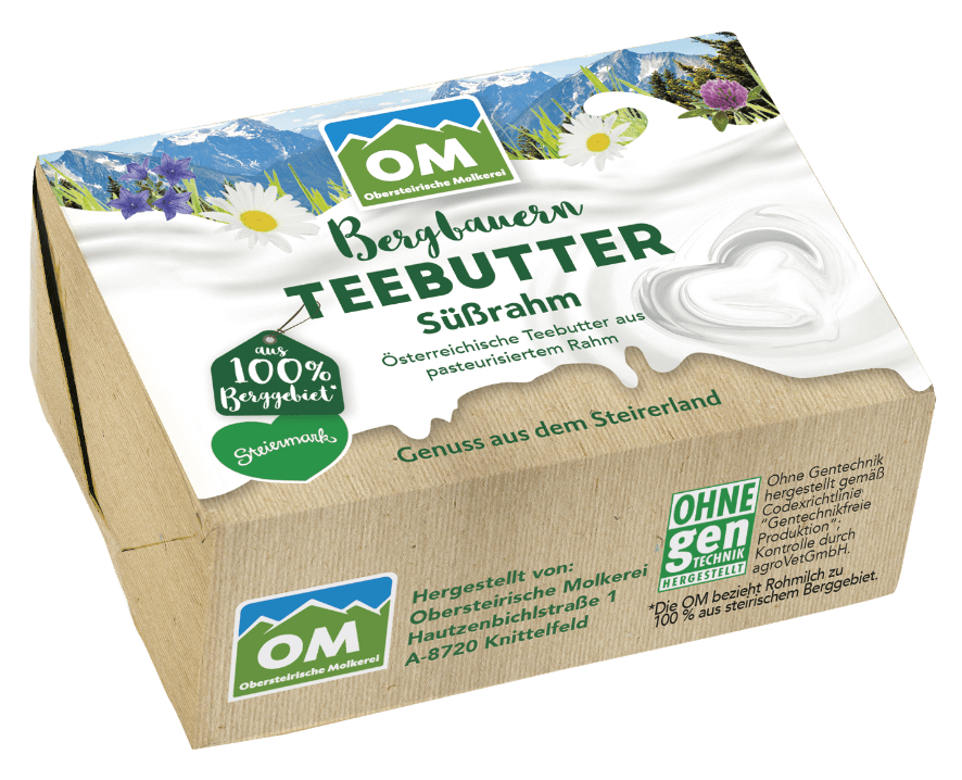 Für die Bergbauern-Teebutter wird ausschließlich frische Sahne aus 100 % Bergbauernmilch verarbeitet. Daraus wird mit höchster Sorgfalt eine streichzarte, fein aromatische Süßrahmbutter gefertigt. Die kurzen Wege von den kleinstrukturierten Betrieben zur Molkerei und die schonende Verarbeitung sichern konstant hohe Qualität. Perfekt für die Brotzeit, zum Backen oder als hochwertige Basis für die warme Küche.