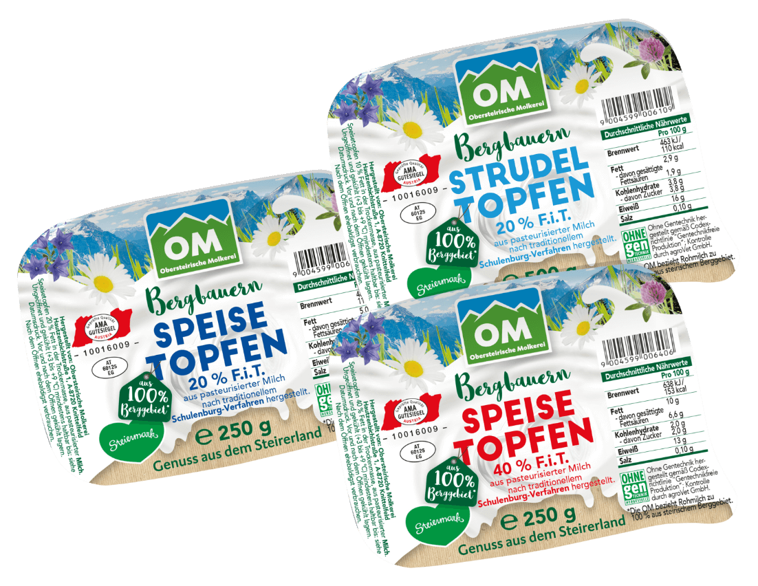 Wir bieten ein vielfältiges Sortiment in höchster Qualität, das die komplette weiße und bunte Palette umfasst. Die OM verarbeitet die erstklassige Rohmilch aus dem steirischen Berggebiet zu bester Milch und hochwertigen Milchprodukten wie Jogurts, Topfen, cremiger Butter u.v.m.